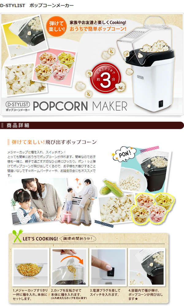 ●弾けて楽しい!飛び出すポップコーン。メジャーカップに種を入れ、スイッチオン!とっても簡単におうちでポップコーンが作れます。簡単なのでお子様も一緒に、親子で過ごす大切なひと時にぴったり。ポン!っと弾けてポップコーンが飛び出してくるので、お子様も大喜びすること間違いなしです☆ホームパーティーや、お誕生日会にもオススメです。