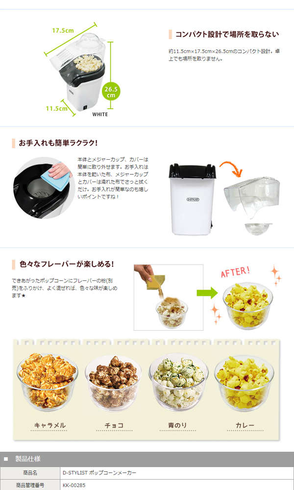●いろいろなフレーバーが楽しめる!できあがったポップコーンにフレーバーの粉(別売)をふりかけ、よく混ぜれば、色々な味が楽しめます。
