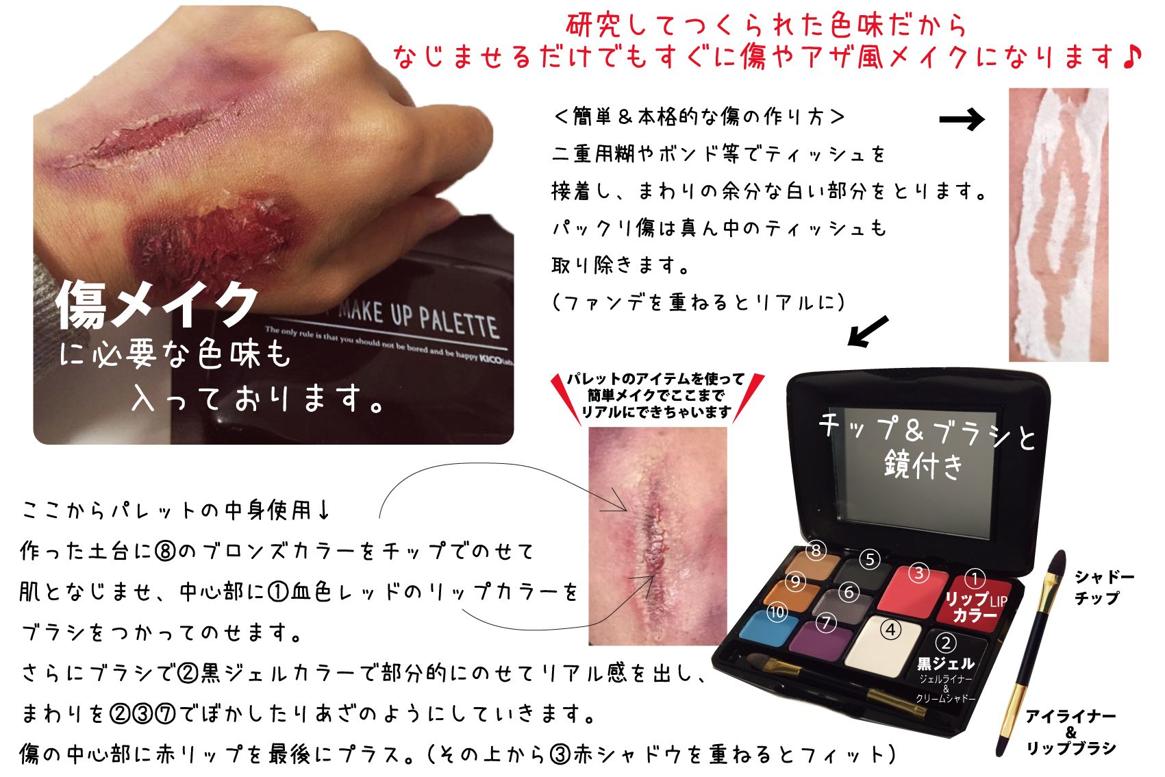 I bought it for the makeup of the Halloween party of my daughter 's English conversation school in October! Even if the child is rampant the makeup will not collapse but if you rub your eyes ... (laugh) attention is needed! In a sense it becomes a horrible zombie (lol) I also tried to make a scratch makeup with face paint on the upper child. Last year I made it with my stock, so I could not make a good wound makeup, but with this palette the quality I said is "blood is real and scary." In addition, I think that I would like to use it for my usual makeup as a short-time mama ♪ I buy it and think that it is right answer.