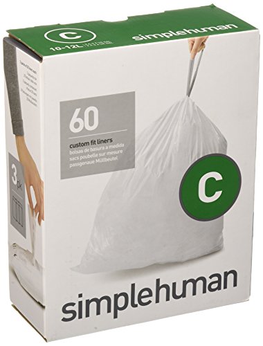 simplehuman Code C Custom Fit Liners, Drawstring Trash Bags, 10-12 Liter / 2.6-3.2 Gallon, 3 Refill Packs (60 Count)
