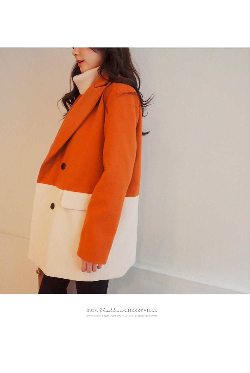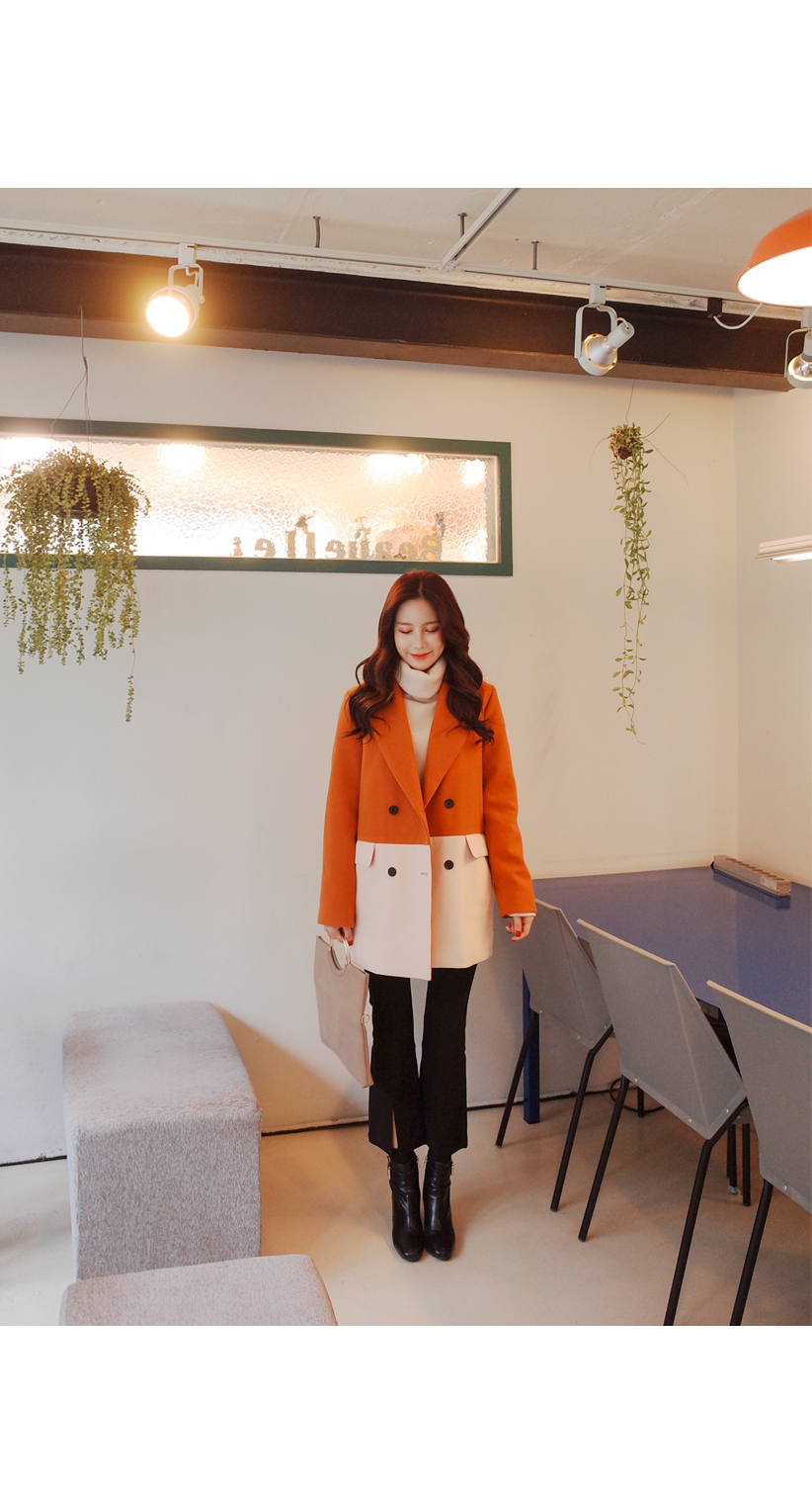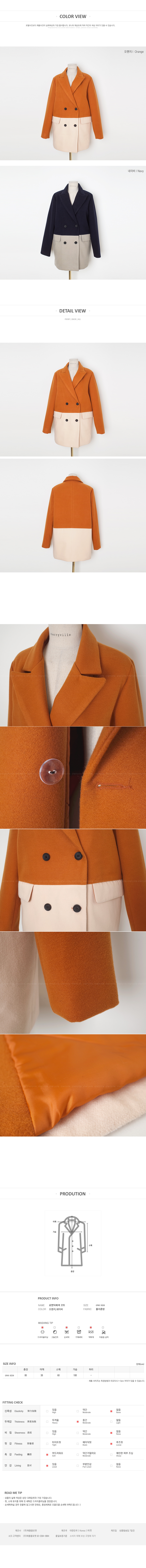 더블버튼 스타일이며 양쪽 포켓이있는 심플한 디자인의 배색코트입니다