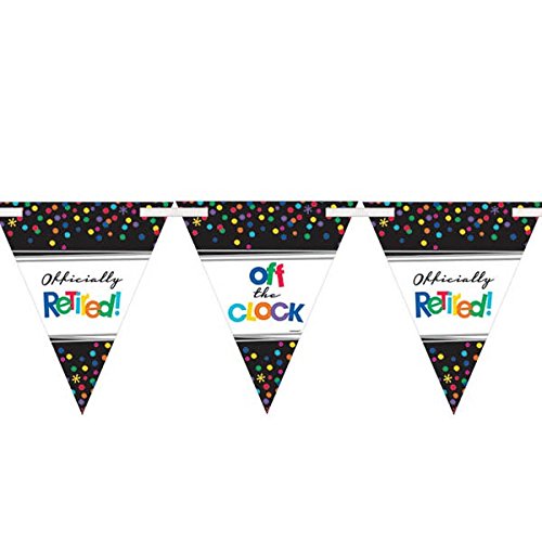 -. Binding : Toy -. Brand : Amscan -. Color : Multi Color -. EAN : 0013051594589 -. Feature : Paper pennants say "Officially Retired!" on one side and "Off the Clock!" on the other. This double-sided banner has colorful dots that pop off the black background. / Contains:24 Pennants, 7" x 6"1 Ribbon, 15' / Simple assembly required / Perfect for the best retirement party of all time -. IsAdultProduct : 0 -. Label : Amscan - Toys -. Manufacturer : Amscan - Toys -. Model : 120220 -. MPN : 120220 -. PackageQuantity : 1 -. PartNumber : 120220 -. ProductGroup : Toy -. ProductTypeName : TOYS_AND_GAMES -. Publisher : Amscan - Toys -. Size : 15' -. Studio : Amscan - Toys -. Title : Fun-Filled Retirement Party "Off the Clock!" Pennant Banner Decoration, Paper, 15' -. UPC : 013051594589 -. Warranty : No Warranty