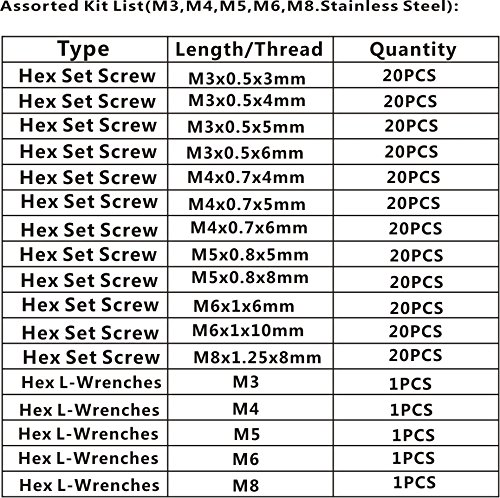 HVAZI 240pcs M3 M4 M5 M6 M8 Metric 304 Stainless Steel Hex Socket Set Screw Assortment Kit