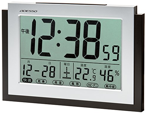 -. Feature : サイズ:(約)高さ13.8×幅20.0×奥行き7.0cm (スタンドを広げた場合) / 本体重量:(約)319g / 材質:ABS樹脂 / 生産国:中国 / 機能:電波受信機能(自動受信、手動受信)、電子音アラーム、スヌーズ機能、2アラーム時刻設定、温度表示、湿度表示、環境管理アイコン表示(乾燥、高温、風邪、カビ・ダニ、熱中症)、グリーンバックライト / 電源:単3型乾電池×2 / 付属品:単3型乾電池×2、取扱説明書兼保証書