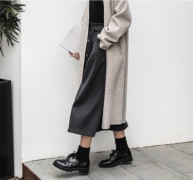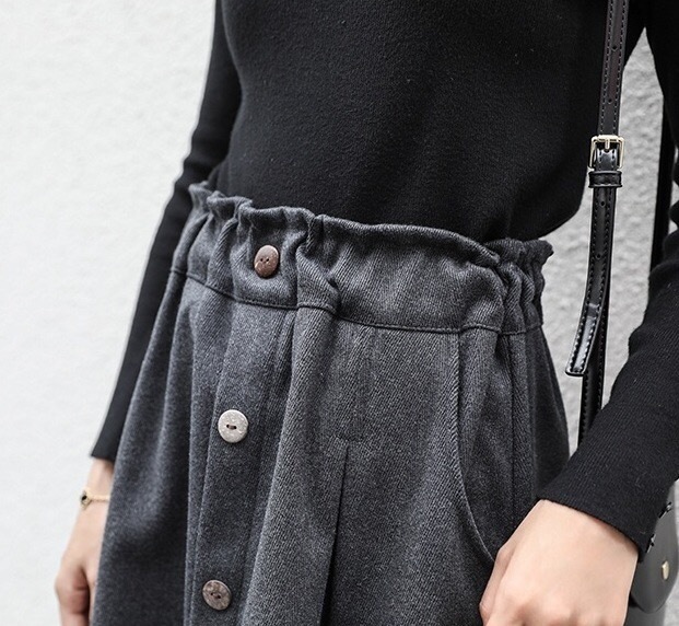 ウエストはゴムで履きやすく、中心のボタンデザインが目を引き、しっかりと広がった裾がすらっと脚長効果を演出してくれます。