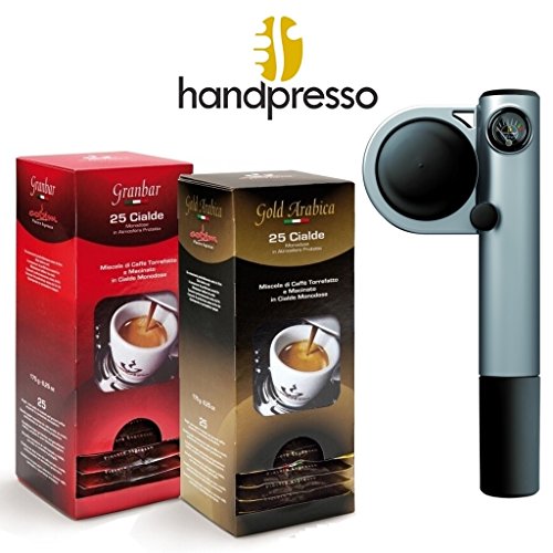 -. Feature : Handpresso "PUMP" silber / geeignet für Kombination: Espresso gemahlen + Espresso-Pads E.S.E. / Druck: 16 bar // Wasserreservoir: 50 ml / Sehr kompakt: 22x10x7 cm // leichtes Gewicht: 476 g / 1 Karton mit 25 ESE Espresso Pads Gold Arabica und 1 Karton mit 25 ESE Espresso Pads Granbar