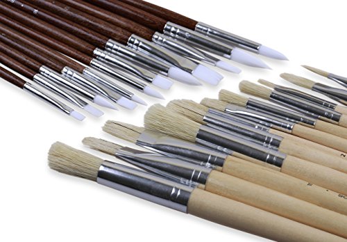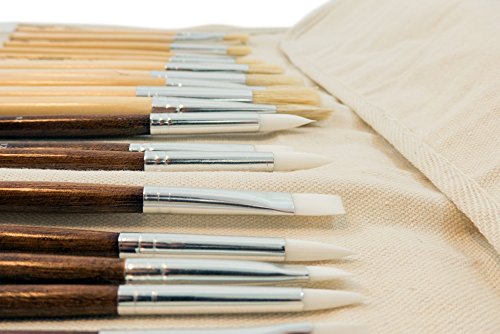 - Set of 24 brushes + 1 Canvas storage roll up. 12 tan natural brushes, 12 white nylon brushes. Work great for acrylics, watercolor, oil, face painting