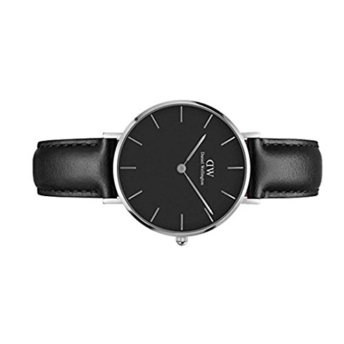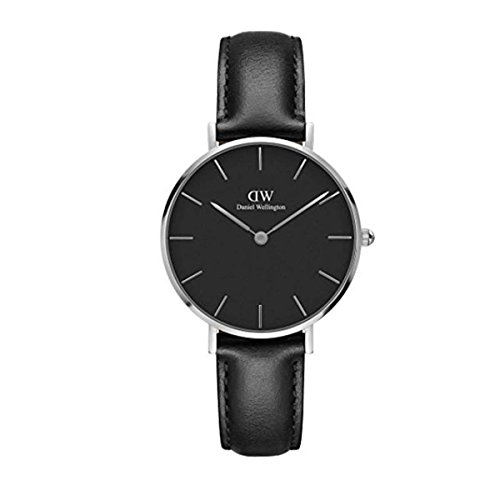Stainless steel case with a black leather strap. Fixed stainless steel bezel. Black dial with silver-tone hands and index hour markers. Dial Type: Analog. Quartz movement. Scratch resistant mineral crystal. Pull / push crown. Solid case back. Case size: 32 mm. Case thickness: 6 mm. Round case shape. Band width: 14 mm. Tang clasp. Water resistant at 30 meters / 100 feet. Functions: hour, minute. Casual watch style. Daniel Wellington Classic Petite Sheffield Ladies Watch DW00100180.Feature