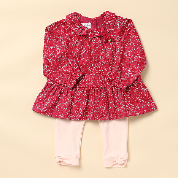 은은하면서도 깨끗한 도트나염 프린트의 우븐 상하복입니다