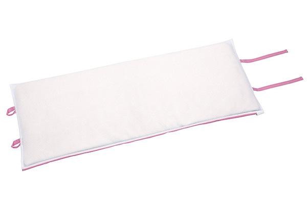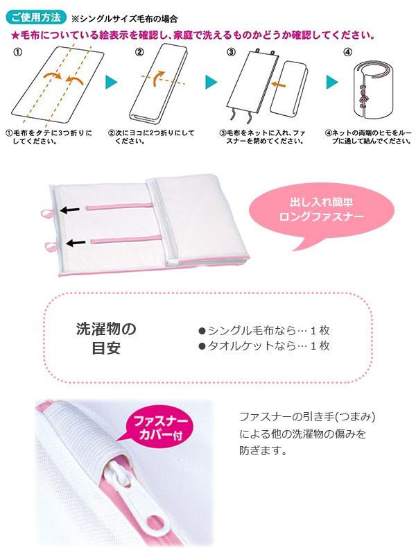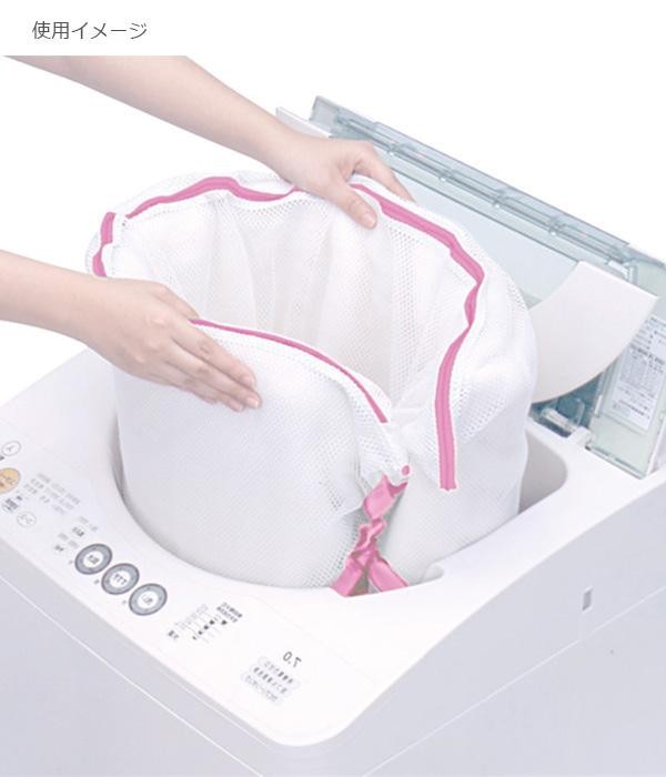 筒状にセットできるヒモ付きです。洗濯物を傷めないようにネットの縫い代をバイアステープでくるんであります。また、ファスナーカバーが付いており、ファスナーの引き手(つまみ)による他の洗濯物の傷みを防ぎます。家庭用ドライ洗剤でも使用できます。 |