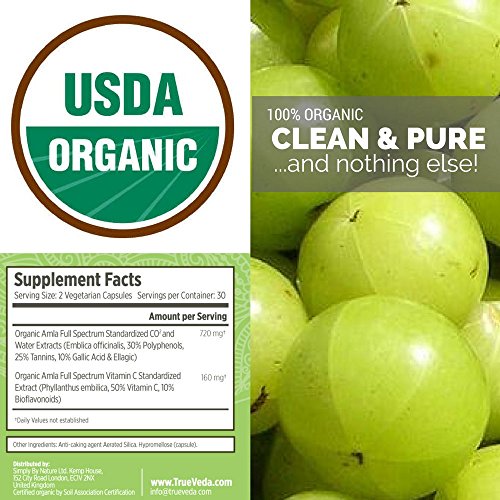 USDA ORGANIC CERTIFIED: There are higher regulatory standards we have to meet to attain the USDA Organic Certification but we do this to guarantee you get a safe, high quality and effective supplement. Our capsules only contain Organic Amla, are suitable for vegetarians and vegans and we use ZERO fillers and ZERO binders - True Veda is 100% organic without compromise!