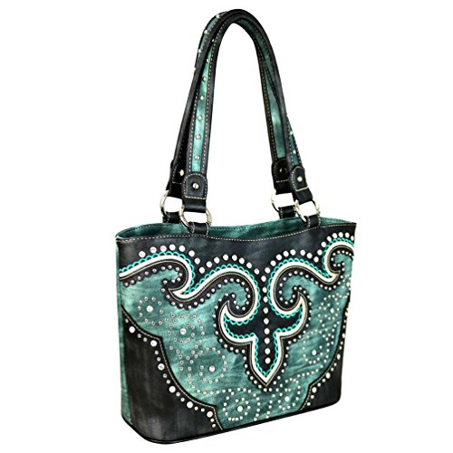 Western tote handbag is made from high quality premium faux/imitation turquoise PU leather (distressed color) has cut-out western pattern design outlined with saddle and scallop stitch accented with silvertone and crystal studs on the front