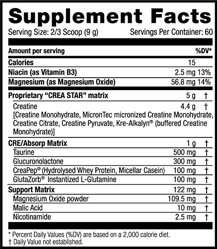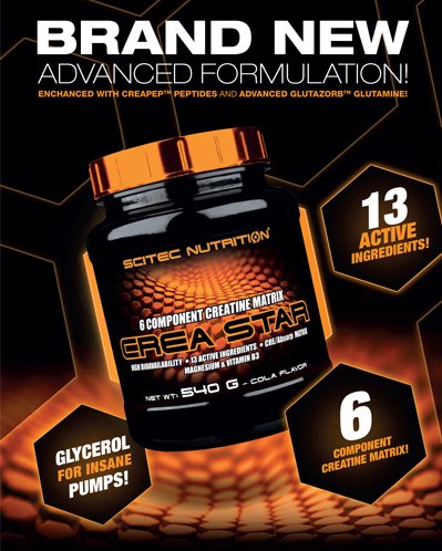Scitec Nutrition presents: Crea Star, our most advanced creatine formulation, comprised of 6 types of Creatine and added ingredients to help with absorption. Our novel CREA STAR formula drives more energy in your muscles by providing you with the most popular and most studied Creatine Monohydrate in different forms (e.g. Kre-Alkalyn®, the buffered Creatine Monohydrate) together with other effective ingredients to help with absorption. Crea-star is an excellent product for those who take part in explosive training such as Weightlifting or high-intensity Interval Training, due to its ability to enhance the body's capacity for performing high-intensity work. The product is ideal for Pre, Intra and Post-Workout consumption.Feature