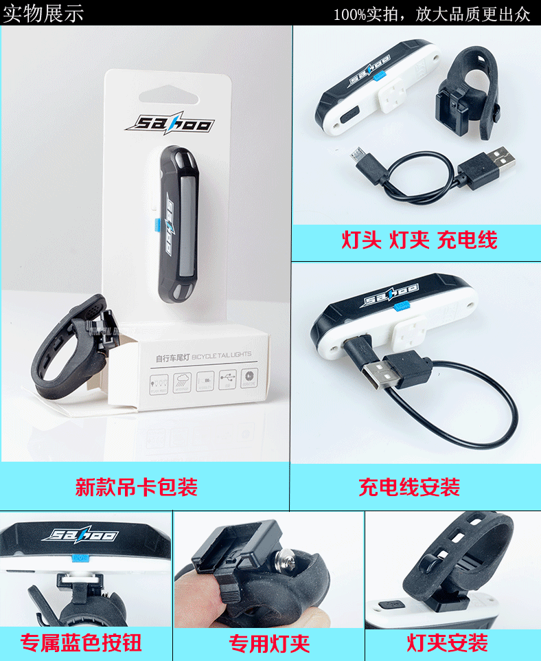 • 1 x Original Sahoo USB Rechargeable Front/Rear LED Light / Box