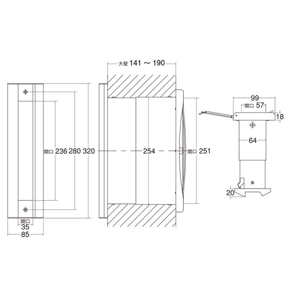 ●スペック:受口部:幅(mm)85 高さ(mm)320 取出し口開口寸法:幅(mm)57 高さ(mm)281 壁厚調整範囲141~191mm