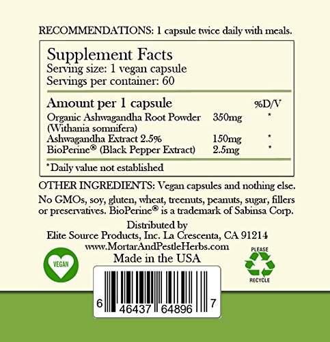 Mortar and Pestle herbs are made with the highest quality ingredients. It is important to us to provide the very best products to our customers. Our Ashwagandha is made with organic ashwagandha root, ashwagandha extract, and BioPerine black pepper extract. Benefits: Ashwagandha is considered an adaptogen which means it promotes balance in many different systems in the body and has a myriad of uses including - Supports healthy stress response Promotes sustained energy, strength and vitality* Supports hormone balance* Promotes thyroid function* Supports the nervous and endocrine system Supports cardiovascular and immune health Fosters healthy sleep patterns Benefits a healthy reproductive system in both men and women. Supports healthy back and joints History of Ashwagandha: Ashwagandha (Withania somnifera) is a plant that has a very long history of use, dating back over 3,000 years in Indian herbal medicine. It is native to the Himalayas, India and North Africa. Also called "Indian winter cherry" and "Indian Ginseng" although there is no relation to the Chinese ginseng root. Why BioPerine? BioPerine black pepper is a natural substance that enhances the absorption to get the most benefit possible. Ayurvedic medicine: One of the world's oldest medical systems which originated from India more than 3,000 years ago and still used today. Ashwagandha is one of the herbs used in this practice. Vegan Capsules: Easy to swallow vegan capsules. Once swallowed they release their contents very quickly. Made in the USA and distributed by Elite Source Products, Inc. * This statement have not been evaluated by the Food and Drug Administration (FDA). This product is not intended to diagnose, treat, cure or prevent any disease. 0 |