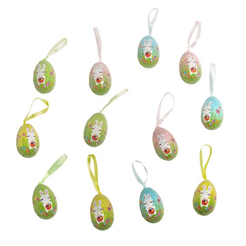 -. Brand : Nantucket Home -. Color : Multi-color -. EAN : 0000032055566 -. Feature : Made of synthetic materials / No 'bunny' does Easter better than you. Colorfully covered in a festive rabbit design, these little hangers are full of springtime cheer / Includes 12 decorative eggs / Top loop for hanging / Measurements: 1.5"Dia. x 2.25"H, each -. Label : Nantucket Distributing -. Manufacturer : Nantucket Distributing -. PackageQuantity : 12 -. ProductGroup : Furniture -. ProductTypeName : HOME_FURNITURE_AND_DECOR -. Publisher : Nantucket Distributing -. Studio : Nantucket Distributing -. Title : Rabbit with Basket Hanging Foam Glitter Easter Egg Ornaments, Set of 12 -. UPC : 000032055566