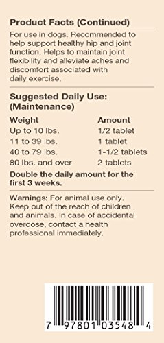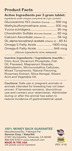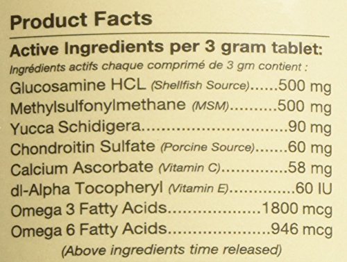 NaturVet Glucosamine DS Level 2 Moderate Joint Care Formulated to Supply Important Joint Support Needs for Adult Pets, Including Large Breeds and Overweight Pets. Provides Important Antioxidants and Helps to Support the Structural Integrity of Joints and Connective Tissue. Helps Alleviate Aches and Discomfort Associated with Daily Exercise. Time Release, Tasty Chewable Tablets 240ct for Dogs. Recommended to Double the Suggested Daily Amount for the First 3 Weeks. Active Ingredients Per 3 Gram Tablet: Glucosamine, Methylsulfonylmethane, Yucca Schidigera, Chondroitin Sulfate, Calcium Ascorbate (Vitamin C), DL-alpha-tocopheryl acetate (Vitamin E), Omega-3 Fatty Acids and Omega-6 Fatty Acids. All NaturVet Products are Veterinarian Formulated and Manufactured in the USA in an FDA Audited, cGMP Compliant Facility with a 100% Satisfaction Guarantee.Feature