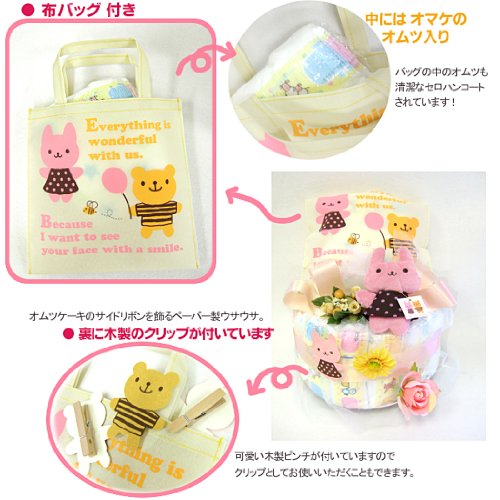 -. Feature : 赤ちゃんの手に優しい手触りのぬいぐるみと、可愛い木製ピンチ付き。 / お散歩用の布バッグの中におまけのオムツが包装されて入っています。 / 【作品の大きさ】 直径21cm・高さ22cm程度 Sサイズ23枚程 / 【オムツ】使い易く人気の高い「グーン」の紙おむつを使用。 / おむつ部分:フィルムコートされ衛生的!ギフトラッピング致します(無料)