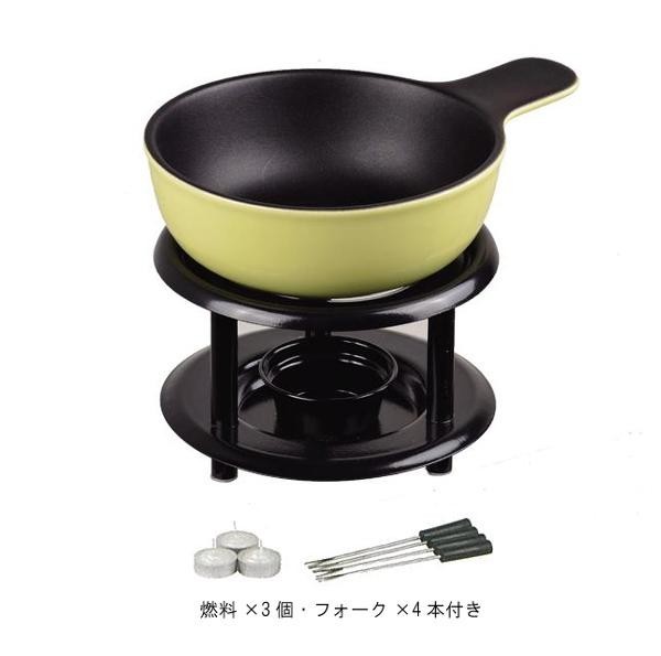 | 素材・材質 | 表面加工:ふっ素樹脂塗膜加工 本体:陶器 スタンド:鉄(焼付け塗装) フォーク金属部:鉄(クロムめっき) 樹脂部:ポリプロピレン 燃料:パラフィン |