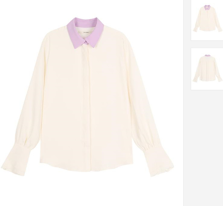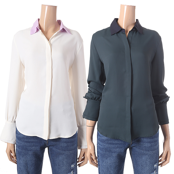 아이보리 색상의 깔끔함이 돋보이는 블라우스 입니다. 배색 카라가 포인트로 디자인 되었으며 소매 밑단 프릴 장식 디테일로 여성스러운 감각을 더하였습니다.