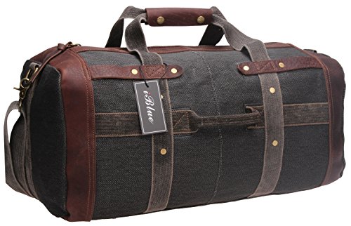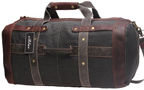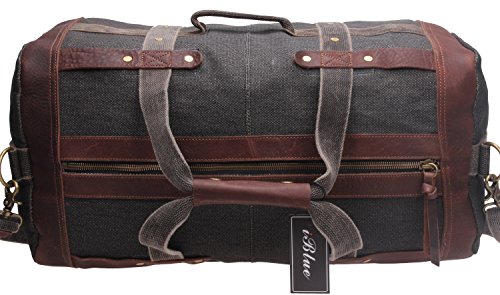 BASIC INFORMATION - Warranty :3 Years Quality Warranty. - Brand: Iblue - Material: Canvas Genuine Leather - Hardware: Bronze Copper - Closure Type: Thick Large Zipper - Color : Dark Coffee,Grey - Weight: 1.6kg - Gender: Women Men - Style: Duffle Bag/Overnight Bag/Travel Weekend Bag/Business Garment Tote - Size(Without Handle) : 22'L X 8.2'W X 10'H Inches, The Height Of Handle : 6.5 Inch. PRODUCT FEATURES: 1. Stitching Is Tight Together And Quality Waxed Thread Was Used. 2. Hardware On Zipper,Handles And Shoulder Strap,Is All Heavy Duty,To Match The Rest Of The Bag Quality. Handles Are Stitched In Place To Last Forever. 3.There Are Some Pockets Lining The Interior Walls Which Are Convenient For Storing Glasses, Overnight Supplies, Or Any Other Items You Want To Be Easily Accessible. 4. The Leather Parts Are Not Only Decorative, But They Contribute To The Overall Stability Of This Product.
