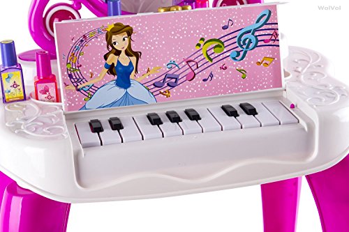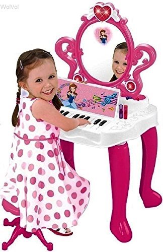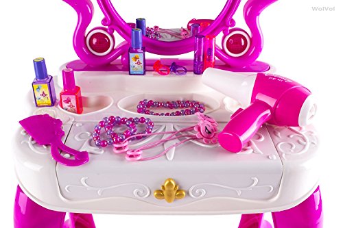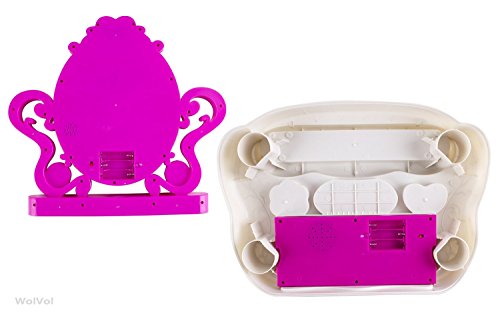 This vanity toy set includes everything a child could imagine in a vanity set. 1 necklace, 2 bracelets, 2 rings, 2 lipsticks, 3 nail polish, 2 stylish hair rubbers, comb, battery operated hair dryer, mirror, small chair and an installed piano. Perfect for little girl to explore her imaginations. The WolVol girls vanity play set will keep her occupied for hours of fun and pretend play. The installed piano is an additional feature to the all in one vanity set! Already played with the cosmetics for hours and want now to switch your play toy? open the piano and learn how to play on the keyboard! Press the heart-shaped button on the mirror and a glowing princess will appear on mirror and music will play. Note: there is a separate power switch in back of the mirror and separate power switch on bottom of the dresser, you need to power both switches on so everything could play. A great gift idea for kids who deserve it. Nice big colored packaging.Feature
