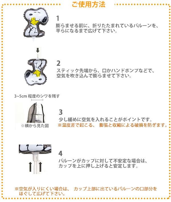 | 6種類の可愛いバルーンピックです。表面にスヌーピーたちのイラストが描かれています。逆止弁付きで空気が抜けにくい仕様です。イラストに合わせてバルーンの形が違うのもカワイイ!! |