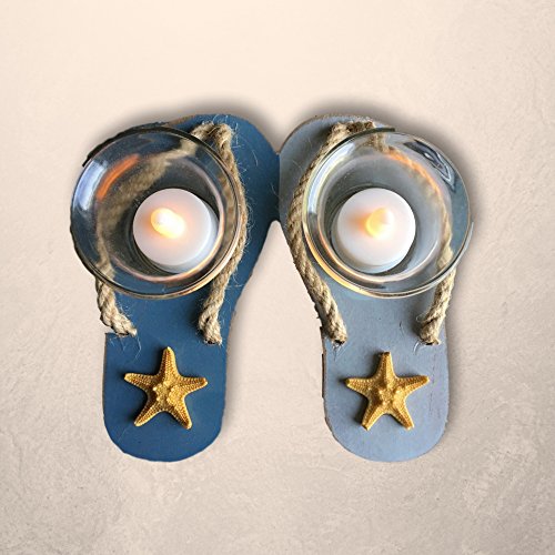 [Product Information]- BEACH DÉCOR. This cute set of wooden flip flops holds 2 glass tealight holders (non-removable). Each holder comes with a white LED teal light candle. The flip flops are a weathered blue and gray color with an orange starfish design. The flip flops have a jute rope strap accent.