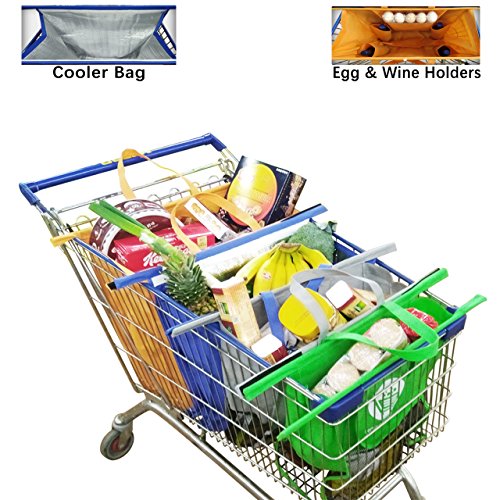 Trolley Bags, Pack of 4, Quality Shopping Bags Include Cooler Bag & Egg/Wine Holder, Easily Bag Groceries from Cart, Sized for Most American Grocery Carts - Detachable, Foldable & Reusable