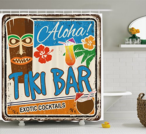 Tiki Bar Decor Shower Curtain by Ambesonne, Rusty Vintage Sign Aloha Exotic Cocktails Coconut Drink Antique Nostalgic, Fabric Bathroom Decor Set with Hooks, 70 Inches, Multicolor