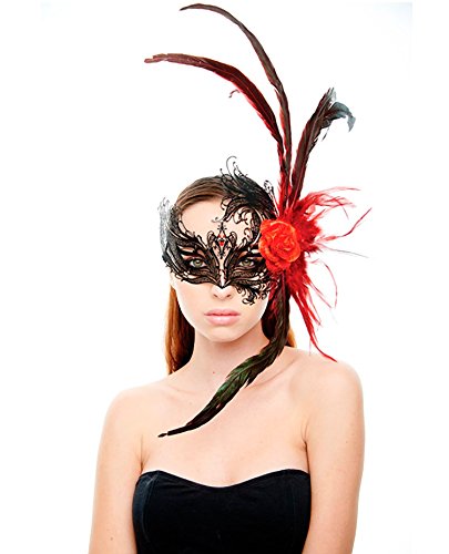 -. Title : Kayso Laser Cut Mask w/Red Rose & Feathers - Black