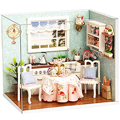 -. Title : Ogrmar Wooden Dollhouse Miniatures DIY House Kit With Cover and Led Light-Happiness Kitchen