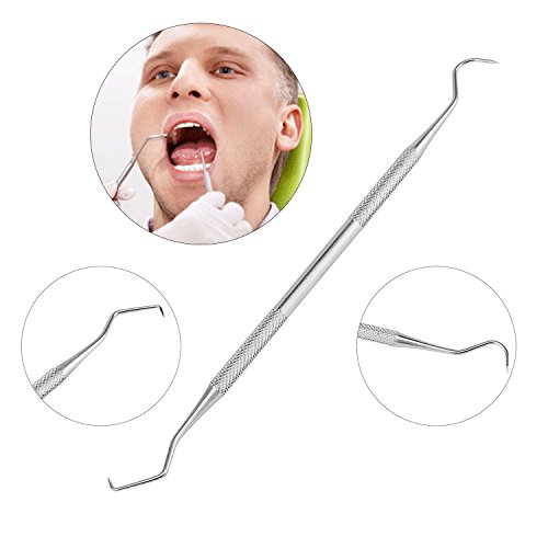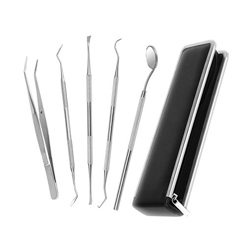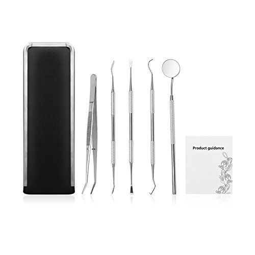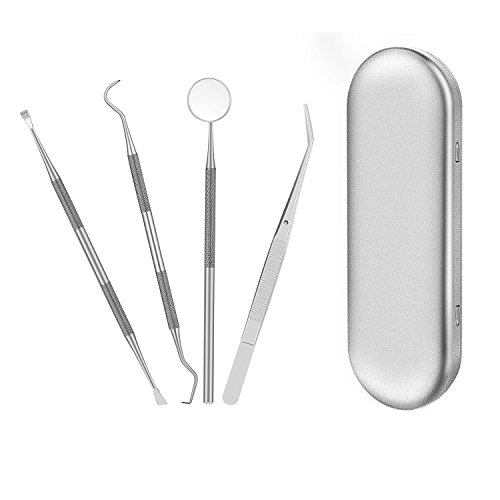 This dental hygiene kit includes stainless steel anti-fog dental mirror(mouth mirror), dental pick/dental explorer/dental probe(metal toothpick). Tweezers (college tweezers), sickle scaler and dental tartar scaler/scraper or tartar remover. A protective case can keep your dental cleaning tools secure.
