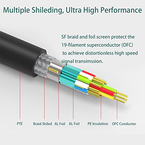 99.99% Oxygen-free Copper (OFC) & Golden-plated Connector & Double Metal Braided Isolation : Maintain strength and durability and effectively prevent electromagnetic interference to make clear and undistorted image.