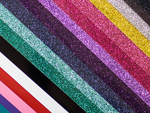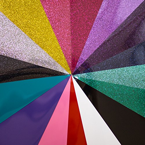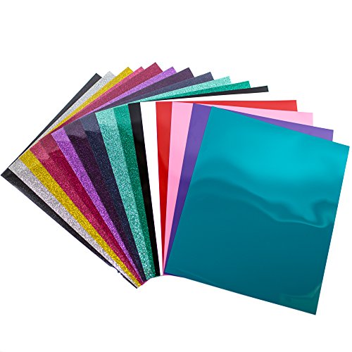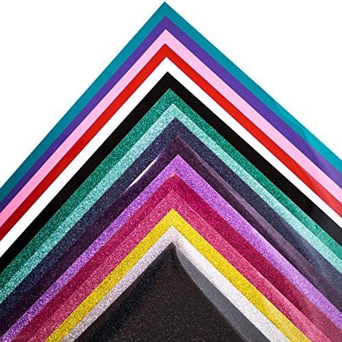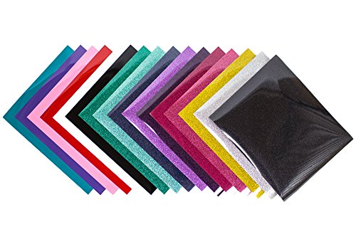 12" x 10" Heat Transfer Vinyl, 16-Sheet GLAM Pack, with 10 Glitter and 6 Regular Colors, For T-Shirts, Hats, Clothing, Iron-On PU HTV Vinyl Bundle for Silhouette Cameo, Cricut, Heat Press Machines