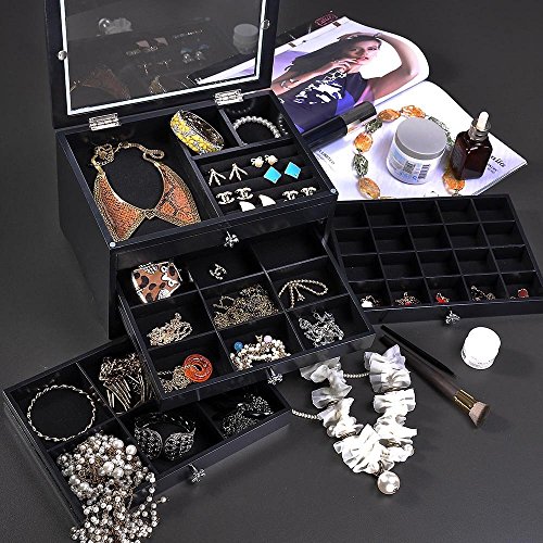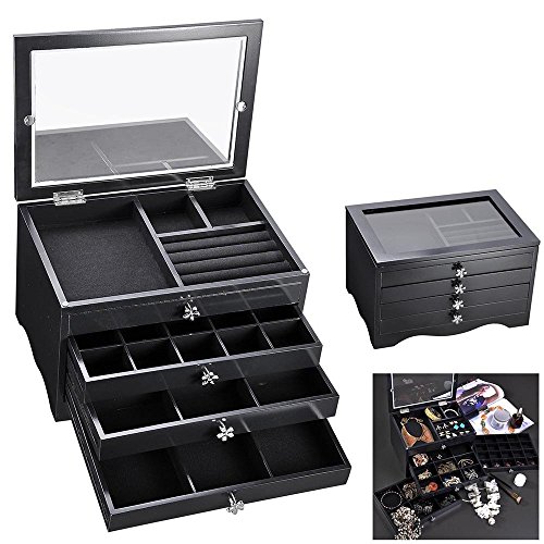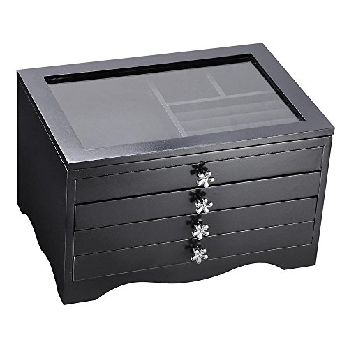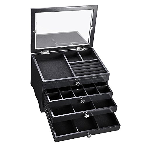 Ampersand Shops' Elegant Jewelry Chest Box Storage Organizer is equipped with three (3) pull-out drawers and a top layer to store your rings, earrings, bracelets and more! It has a clear view top and velvet bottom for each slot. Makes an ideal gift for weddings, bridal showers, graduation, and more! Features: - Elegant flower-shaped drawer knob hardware