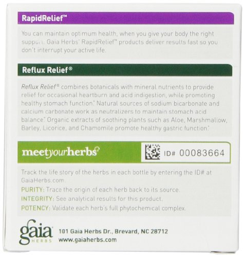 ReleaseDate : 2013-09-11 Studio : Gaia Herbs Publisher : Gaia Herbs Binding : Health and Beauty Product Description Reflux Relief combines botanicals with mineral nutrients to provide relief for occasional heartburn and acid indigestion while promoting healthy stomach function. Natural source of Sodium Bicarbonate and Calcium Carbonate work as neutralizers to maintain stomach acid balance. Organic extracts of soothing plants such as Aloe, Marshmallow, Barley, Licorice, and Chamomile promote healthy gastric function. Conditions that come rapidly can go rapidly, when you give your body the right support. Gaia Herbs' RapidRelief products deliver results fast so you can get back to health and well being. 0