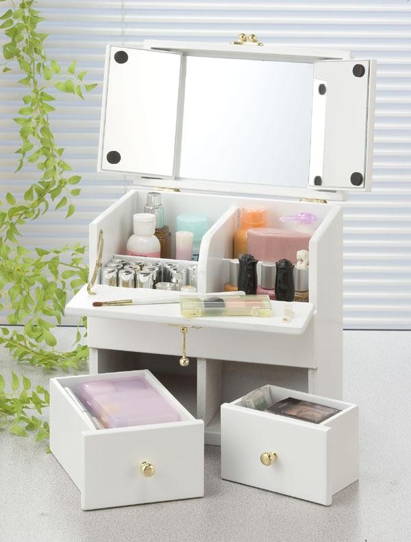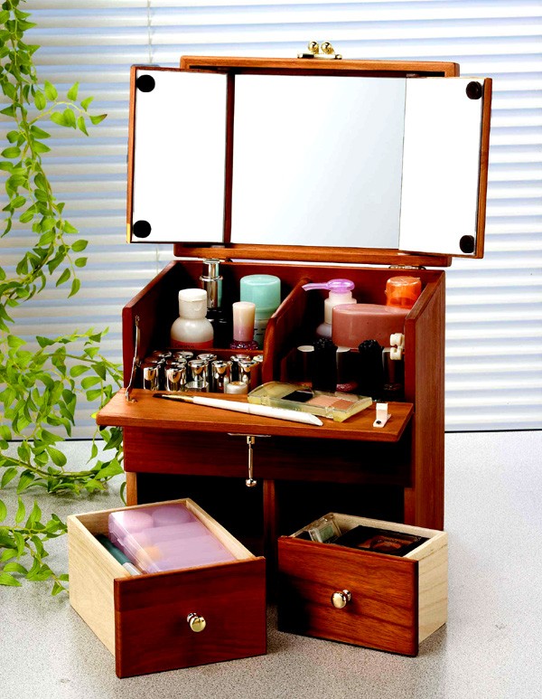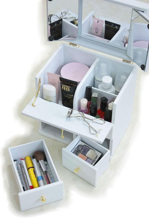 | ボックスが3面鏡に早変わりします。仕切りつきで、ボトルから小物までスッキリ収納できるメイクボックスです。 |