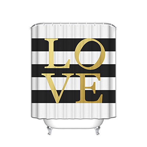 KAROLA Fashion Waterproof Polyester Fabric Gold Love Sign Black and White Stripe Bathroom Shower Curtain with Hooks 60x72IN