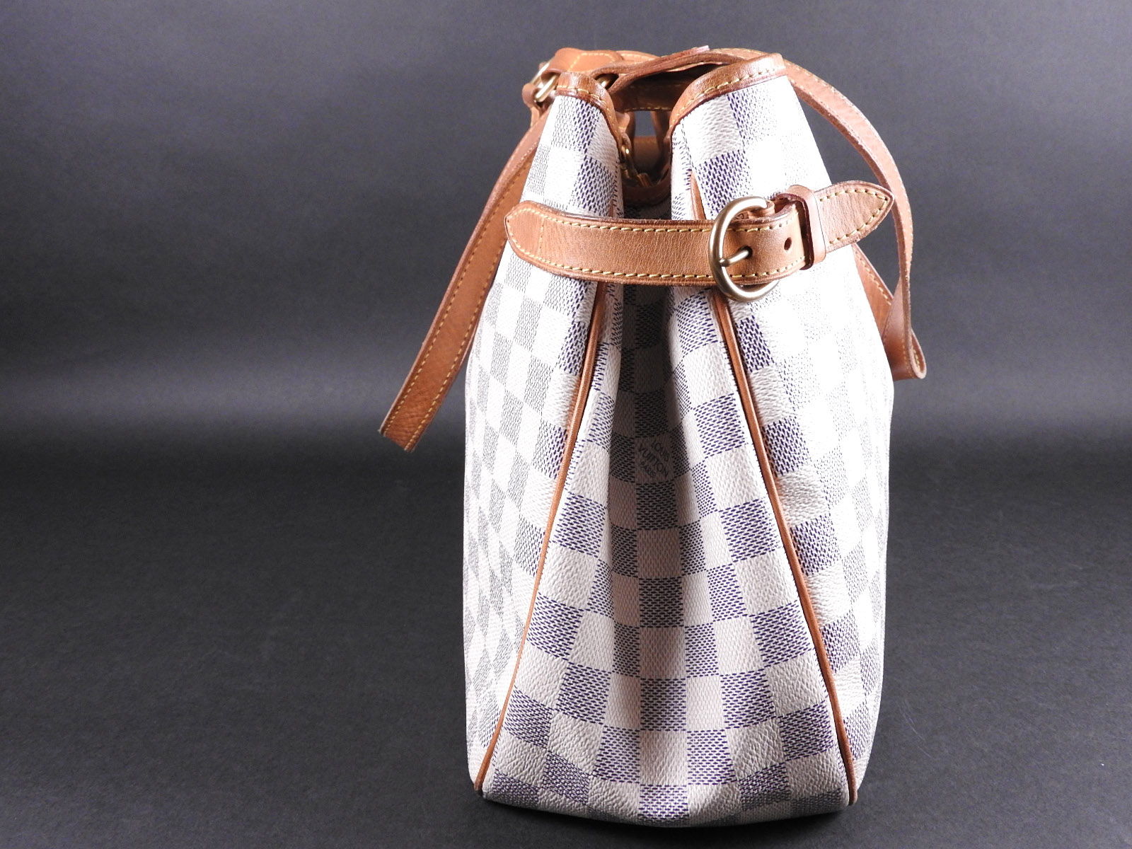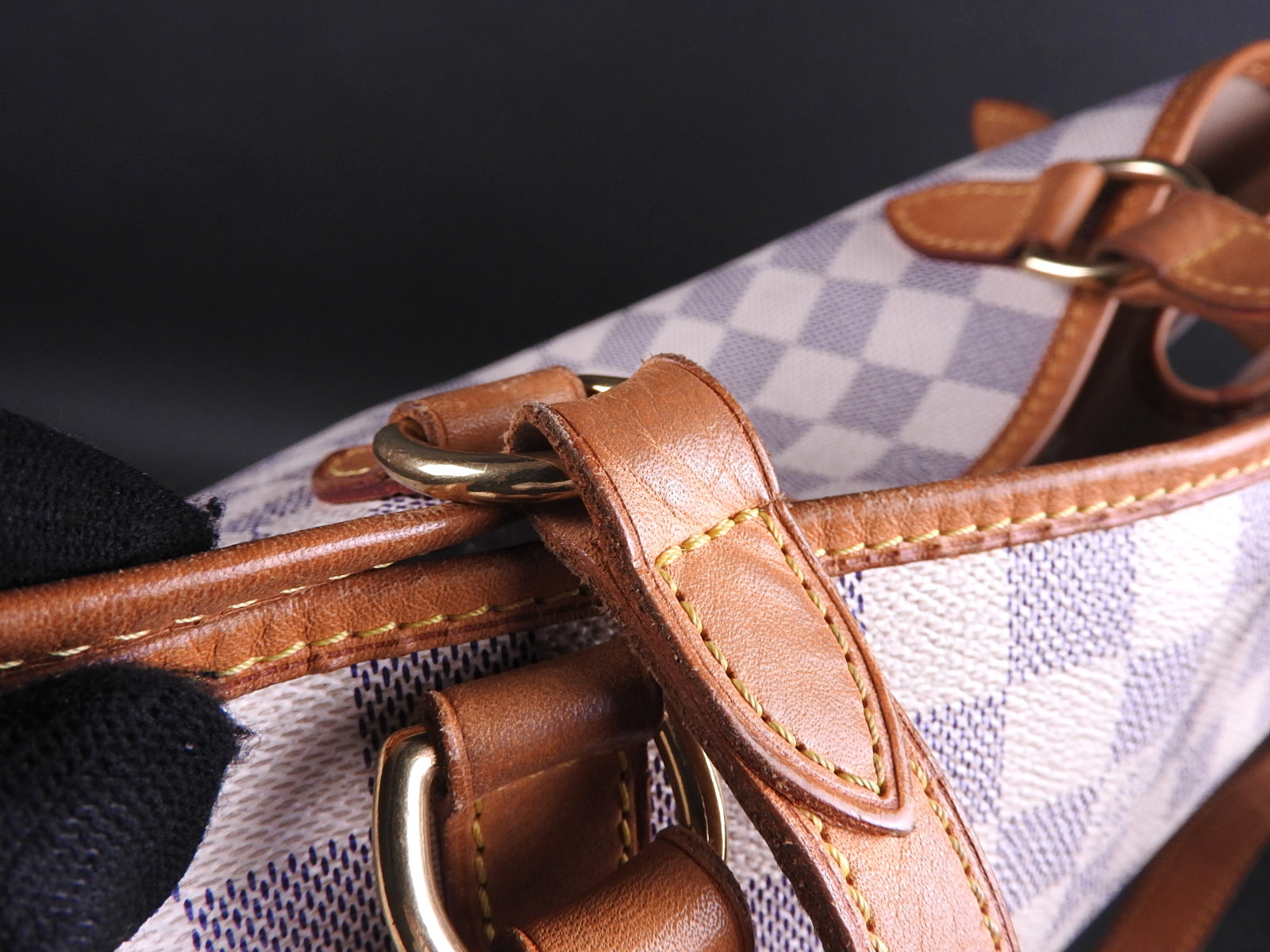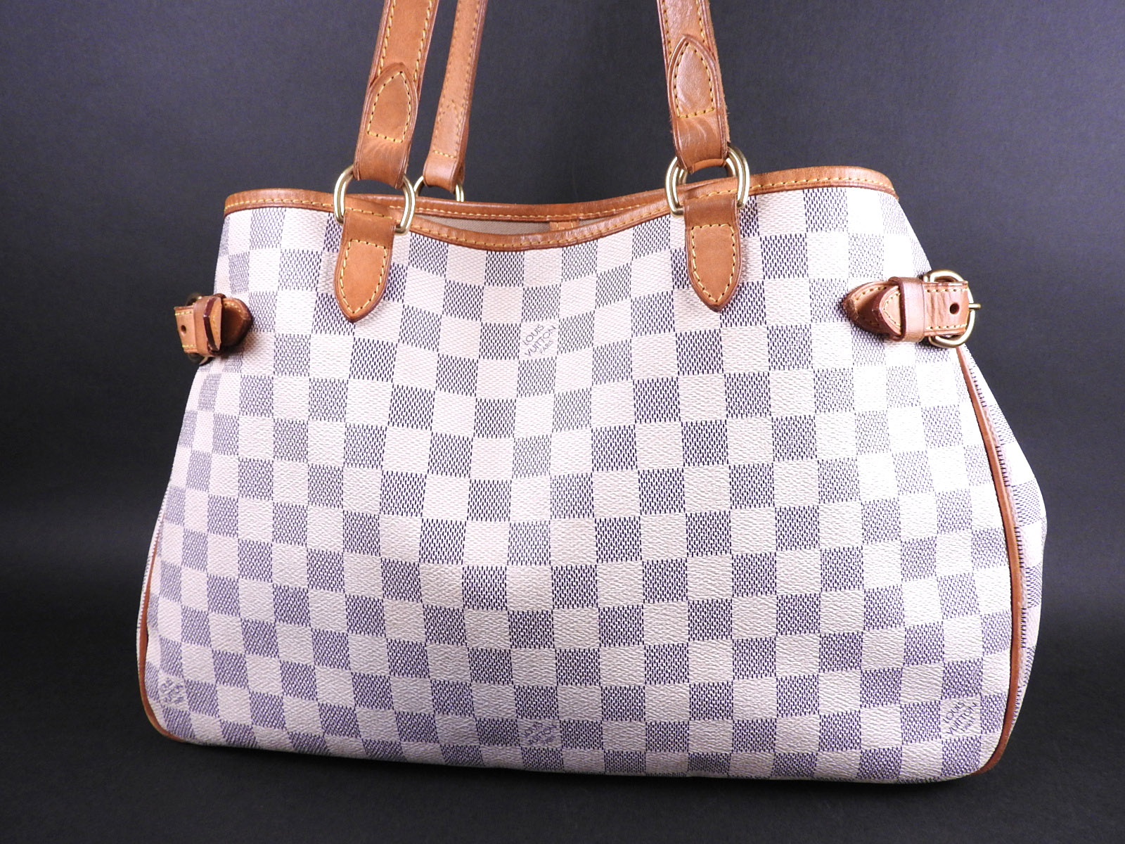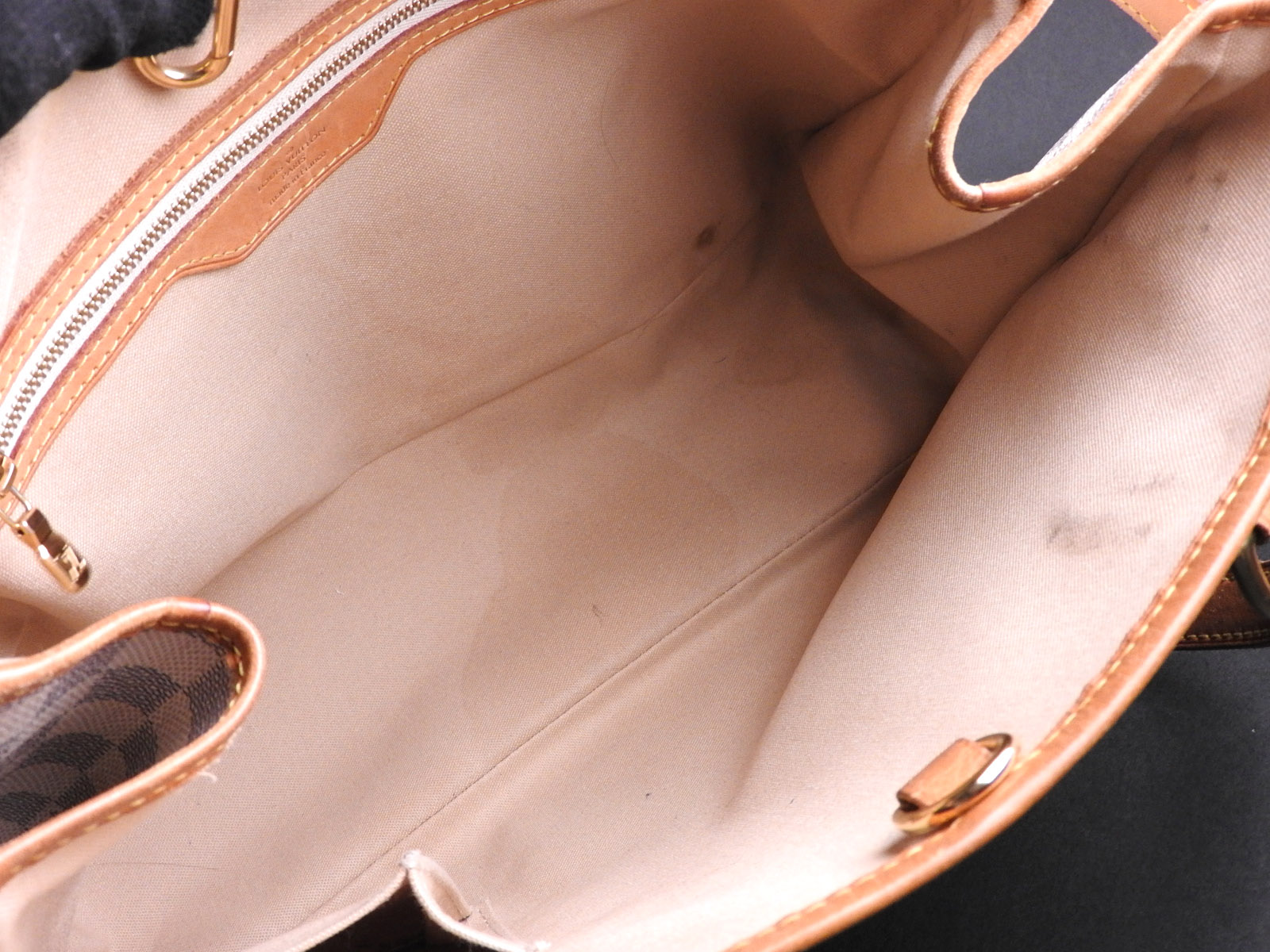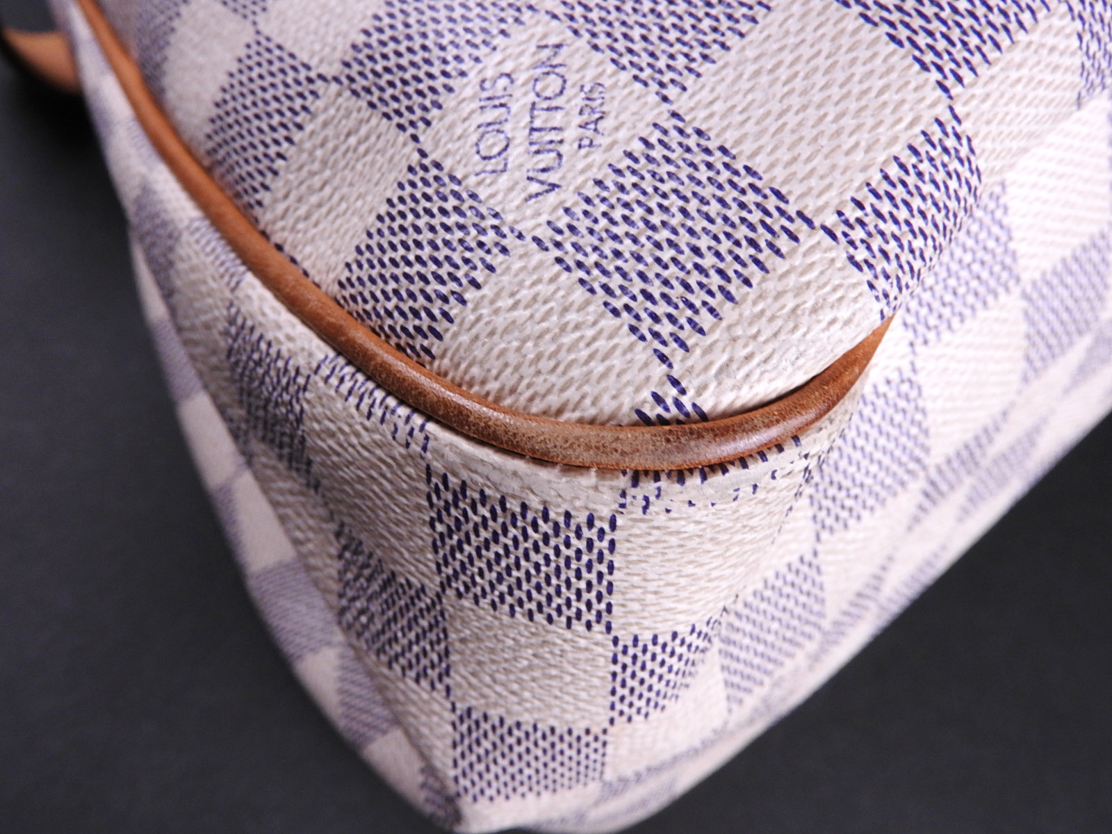 Damier azur canvas: Used feeling. Some stains. Leather: Used feeling. Tanned. Some scratches, stains, wrinkles and abrasions. |