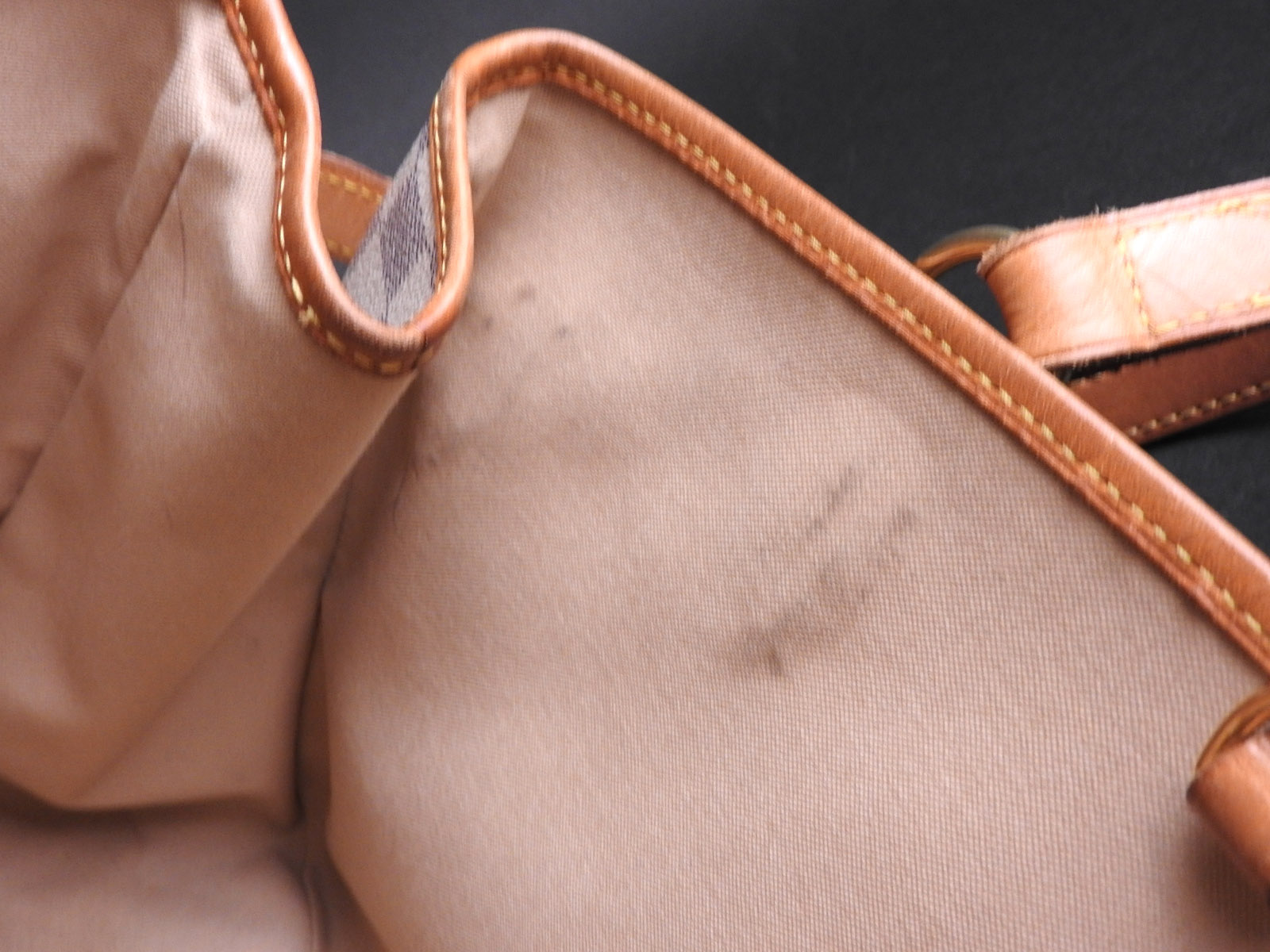 | Corners | Some stains, scuffs and tanning in the piping around the bag. |
