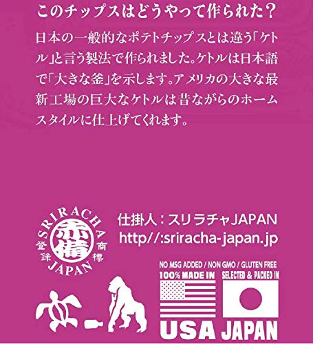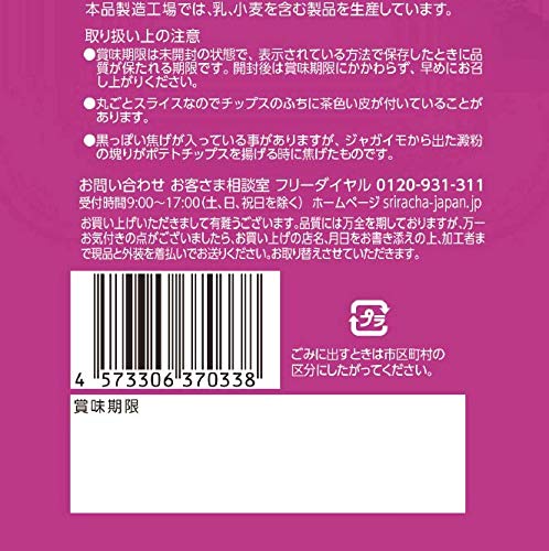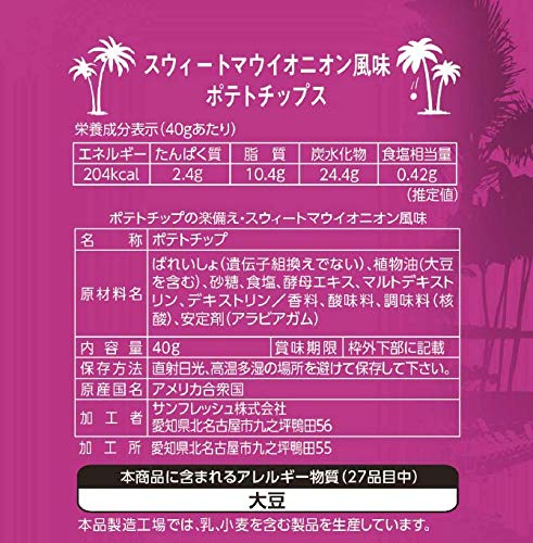 原材料:ばれいしょ(遺伝子組換えでない)、植物油(大豆を含む)、砂糖、食塩、酵母エキス、マルトデキストリン、デキストリン/香料、酸味料、調味料(核酸)、安定剤(アラビアガム)