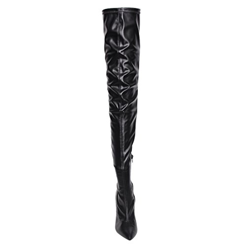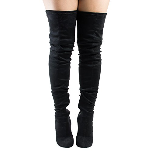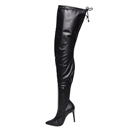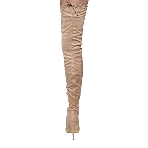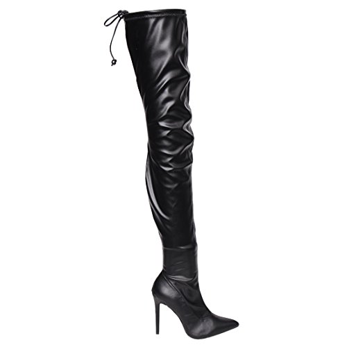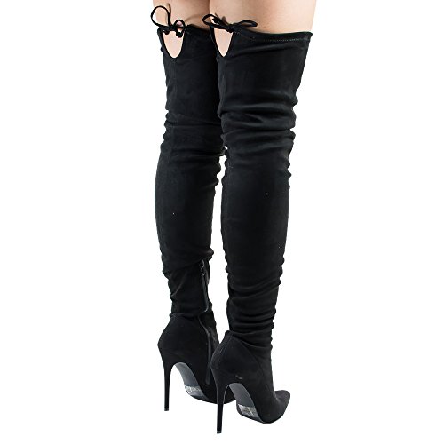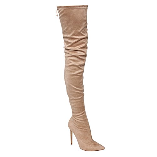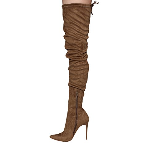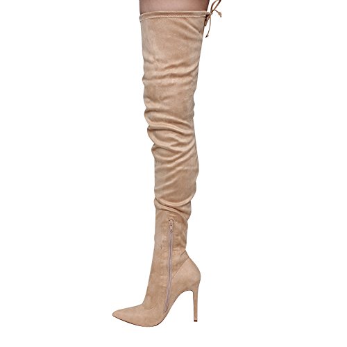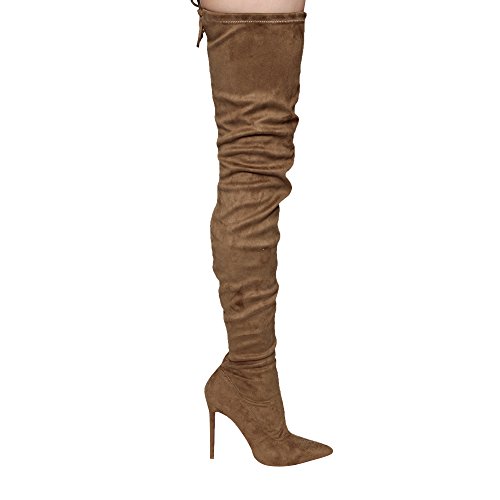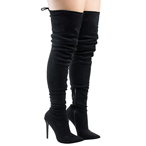 Product Description Embrace an eye-catching style of your own with the pointy toe drawstring thigh high stiletto boots.Featuring faux suede upper,this stretch boot has interior zip closure,drawstring ties at shaft top,sexy covered stiletto heel. 0