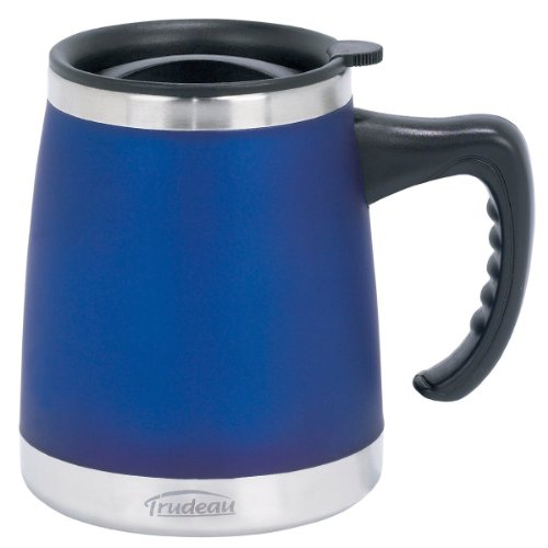 -. Feature : 15-Ounce desk mug by Trudeau / Stainless steel inside wall / Covered mug for even more heat retention; easy to open twist lid / Soft touch body / Red colored exterior; mug has 5 year warranty