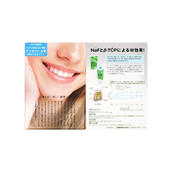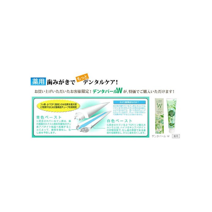 「덴《다파루》W약용 치약(2 중구조 튜브)」서는,불소와β-TCP(하이드로《기시아파타이토》의 전구물질)의 W효과로 이를 아름답고 건강하게 하는 약용 양치질입니다.불소는,치아의 표면의 에나멜질을 내산성의 불소 아파 타이트 결정으로 전환하는 것에 따라,치질을 강화 하고, 뽑아 이를 예방합니다.β-TCP(인산3칼슘)서는,하이드로《기시아파타이토》의 전구물질에,충치아의 원인인 치석을 흡착 제거합니다.