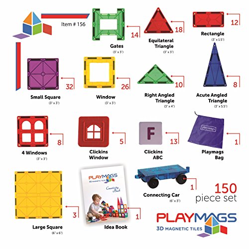 PlaymagsTM Magnetic Building Blocks attract on all sides and the combinations form many different shapes and structures. From flat designs to squares, pyramids, plus many more unlimited geometric shapes. Tiles easily connect, which prompts kids to move from constructing two-dimensional to three-dimensional creations. Magnificent high rise 3D towers are designed by kids who have developed into critical thinkers through creative play. As they build, kids develop tools for spatial problem-solving tasks, logical thinking, and math reasoning. Blocks easily connect and inspire creativity, brain development patterning, shape recognition, building, and motor skills.