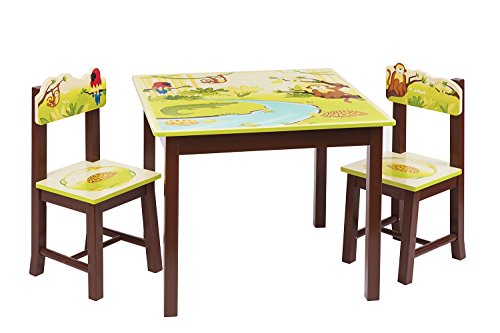 Product Description The Jungle Party collection encapsulates a range of jungle animals from turtles swimming in the river to monkeys swinging through the canopy. Other hand-painted animals include an amicable alligator, a perched parrot, and a pleasant python that will add a colorful story to any child's room or play area. Features a rich, espresso coloration and double-bolt construction on table legs. Angled legs on chairs prevent tipping. 0