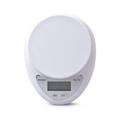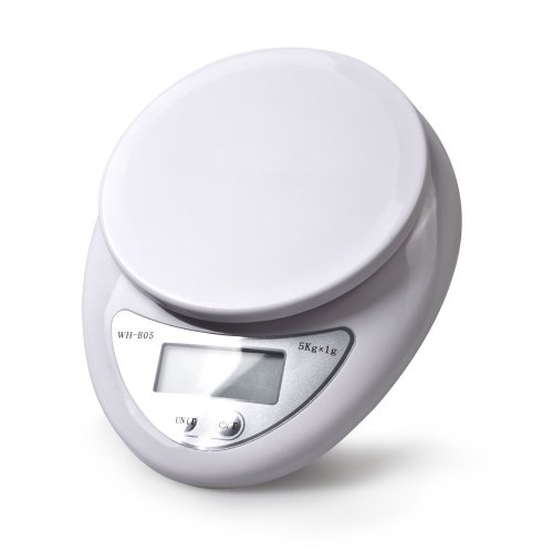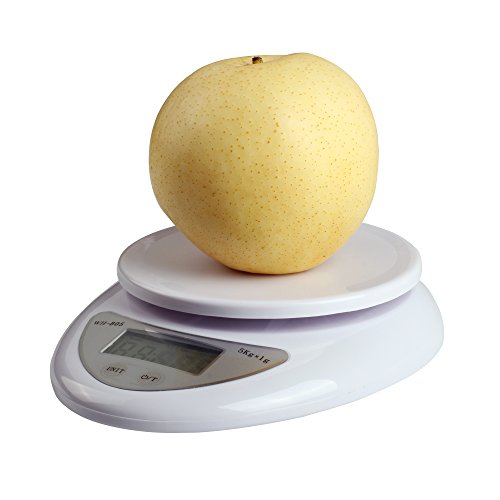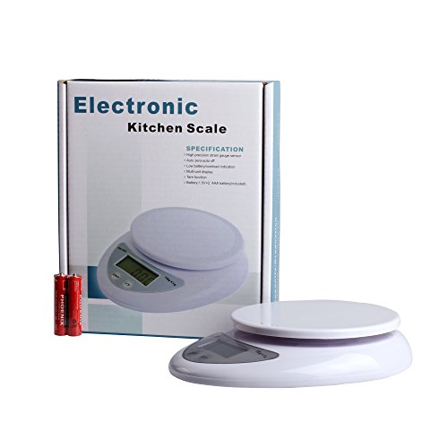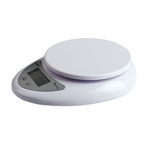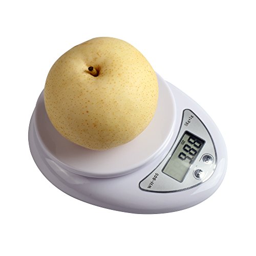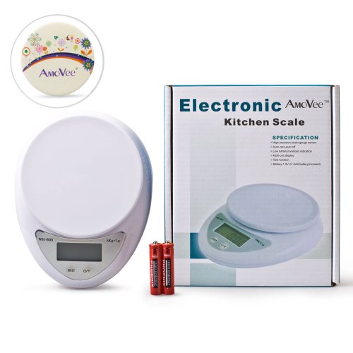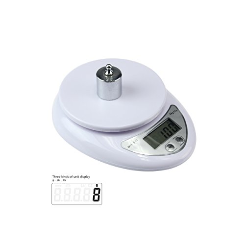 AmoVee 5kg 5000g/1g Digital Kitchen Food Diet Postal Scale Features: * High Quality * Easy to read *Accuracy: 0.1oz / 1g *High precision strain gauge sensor *Auto zero-auto off *Capacity: About 200oz (12.5lb) / 5000g (5kg) *3 different units conversion: G, LB, OZ (1000G=2.2LB=35OZ) *Power: 2 AAA batteries (Included) *Color: White *Size: 18*15.5*4cm *Versatile Scale Can Be Used in Kitchen, Mail Room or Office