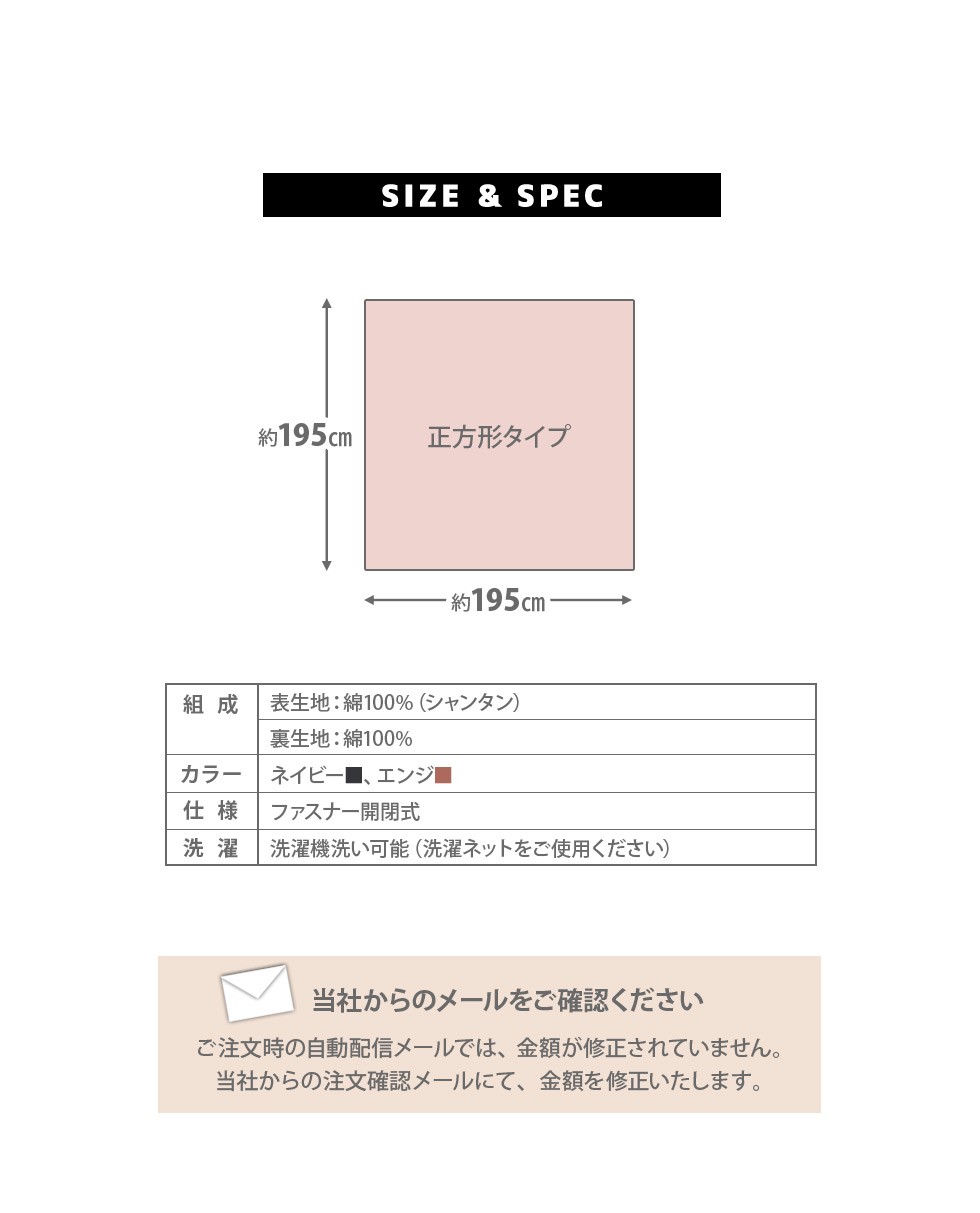 | サイズ | 【正方形】 約195×195cm 【長方形】 約195×245cm |